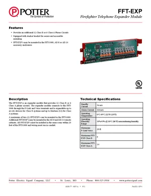 Datasheet for the Potter FFT-EXP, published in 2021. Document No: 8830177, Rev: A. 4 models including FFT-EXP, FFT-1000, AE-8 and 1 additional variants. Detailed technical specifications, electrical ratings, and agency listings.