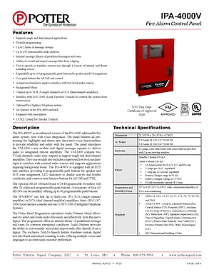 Datasheet for the Potter IPA-4000V, published in 2023. Document No: 8830182, Rev: D. Model IPA-4000V. Engineering specifications, wiring diagrams, and mounting dimensions.