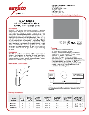 Datasheet for the Potter MBA Series Motor Driven Bells, published in 2004. Document No: MBA-12. Models MBA-6-12, MBA-8-12 and MBA-10-12. Product features, environmental operating limits, and compatibility data.