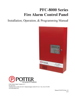 Installation, Operations, and Programming Manual for the Potter PFC-8000 Series, published in 2014. Document No: 5403556, Rev: A2. 20 models including PFC-8500, PFC-8060, ALE-127 and 17 additional variants. Hardware installation, alarm/fault management, and advanced system configuration.