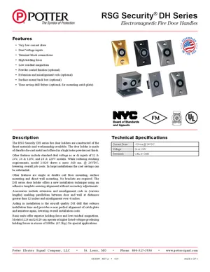 Datasheet for the Potter RSG Security DH Series, published in 2019. Document No: 8820099, Rev: A. 21 models including 1224, 24120, 24220 and 18 additional variants. Product features, environmental operating limits, and compatibility data.