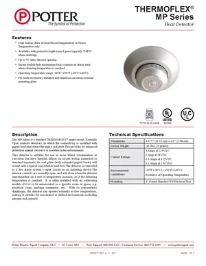 Datasheet for the Potter THERMOFLEX MP Series, published in 2015. Document No: 8830077, Rev: A. 8 models including CR-135MP, CR-165MP, CR-200MP and 5 additional variants. Product features, environmental operating limits, and compatibility data.
