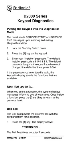 Manual for the Radionics D2000 Series Keypad Diagnostics, published in 1997. Document No: 35110. Models D2000 and D208. Capabilities, specifications summary, and usage notes.