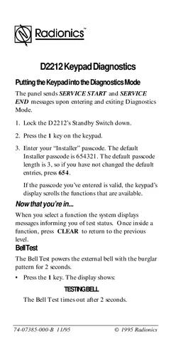 Manual for the Radionics D2212 Keypad Diagnostics, published in 1995. Document No: 74-07385-000-B, Rev: B. Models D2212 and D208. System overview, features and capabilities, and basic operation.