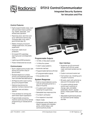 Datasheet for the Radionics D7212, published in 1997. Document No: 34041C, Rev: C. 10 models including D7212, D1255, D1256 and 7 additional variants. Product features, environmental operating limits, and compatibility data.