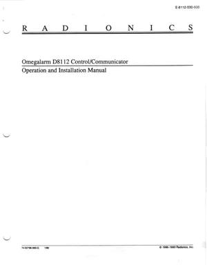 Installation and Operations Manual for the Radionics D8112, published in 1990. Document No: 74-02796-000, Rev: G. 42 models including D8112, D8112F, D8112G2 and 39 additional variants. Hardware mounting, wiring, and user system management.