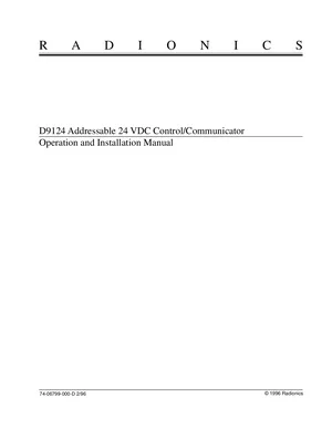 Installation and Operations Manual for the Radionics D9124, published in 1996. Document No: 74-06799-000, Rev: D. 36 models including D9124, D9112LTB, D9101 and 33 additional variants. Hardware mounting, wiring, and user system management.