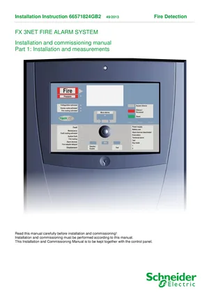 Installation Manual for the Schneider Electric FX 3NET Part 1, published in 2013. Document No: 66571824GB2, Rev: 49/2013. 4 models including FX, FXL, FXM and 1 additional variants. Physical installation guide, backbox dimensions, and cabling specifications.