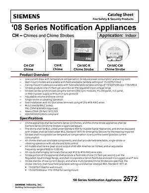 Datasheet for the Siemens '08 Series CH Chimes and Chime Strobes, published in 2009. Document No: 2572, Rev: 1. 8 models including CH-MC-R, CH-MC-W, CH-MC-CR and 5 additional variants. Product features, environmental operating limits, and compatibility data.