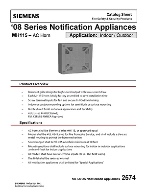 Datasheet for the Siemens 08 Series MH115 AC Horns, published in 2009. Document No: 2574, Rev: 1. Model MH115-R. Engineering specifications, wiring diagrams, and mounting dimensions.