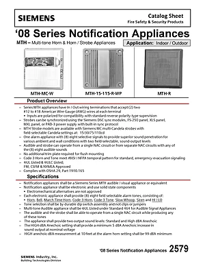 Datasheet for the Siemens '08 Series MTH Horn Strobes, published in 2009. Document No: 2579, Rev: 1. 11 models including MTH-R, MTH-W, MTH-MC-R and 8 additional variants. Detailed technical specifications, electrical ratings, and agency listings.