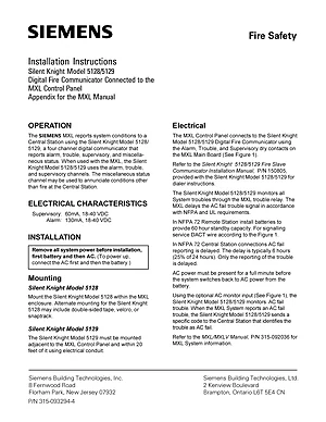 Installation Manual for the Siemens 5128 for MXL. Document No: 315-093294-4. Models 5128 and 5129. Mounting instructions, wiring diagrams, and system power-up procedures.