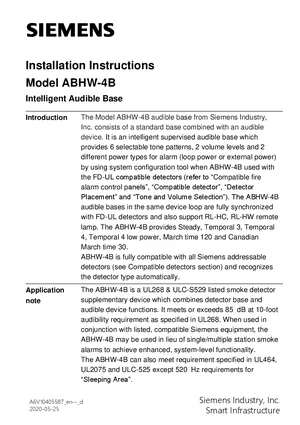 Installation Manual for the Siemens ABHW-4B, published in 2020. Document No: A6V10405587, Rev: d. 42 models including ABHW-4B, ADBH-11, RL-HW and 39 additional variants. Physical installation guide, backbox dimensions, and cabling specifications.