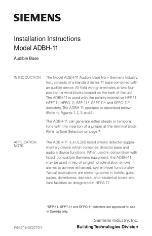 Installation Manual for the Siemens ADBH-11. Document No: 315-033210-7, Rev: 7. 20 models including ADBH-11, HFP-11, HFPT-11 and 17 additional variants. Physical installation guide, backbox dimensions, and cabling specifications.