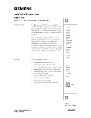 Installation Manual for the Siemens AIC, published in 2003. Document No: 315-035300-3, Rev: 3. Model AIC. Physical installation guide, backbox dimensions, and cabling specifications.