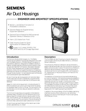 Datasheet for the Siemens Air Duct Housings, published in 2003. Document No: 6124. 4 models including AD-3, AD-3ILP, SA-3 and 1 additional variants. Product features, environmental operating limits, and compatibility data.