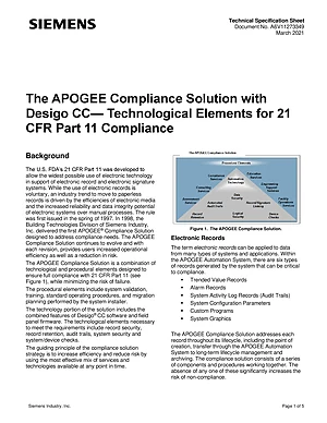 Datasheet for the Siemens APOGEE Compliance Solution for Desigo CC, published in 2021. Document No: A6V11273349. Model APOGEE Compliance Solution. Product features, environmental operating limits, and compatibility data.