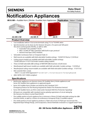 Datasheet for the Siemens AS and AH Series Notification Appliances, published in 2015. Document No: 2578, Rev: 5. 20 models including AS-MC-CW, AS-MC-R, AH-R and 17 additional variants. Detailed technical specifications, electrical ratings, and agency listings.