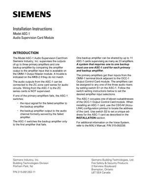 Installation Manual for the Siemens ASC-1. Document No: 315-091263-11. 8 models including ASC-1, OMM-1, OCC-1 and 5 additional variants. Mounting instructions, wiring diagrams, and system power-up procedures.