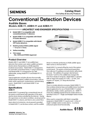 Datasheet for the Siemens Audible Bases, published in 2010. Document No: 6180, Rev: 1. 23 models including ADB-11, ADBH-11, ADBX-11 and 20 additional variants. Detailed technical specifications, electrical ratings, and agency listings.