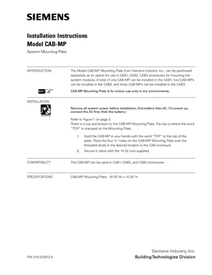 Installation Manual for the Siemens CAB-MP. Document No: 315-033012-4. 4 models including CAB-MP, CAB1, CAB2 and 1 additional variants. Mounting instructions, wiring diagrams, and system power-up procedures.