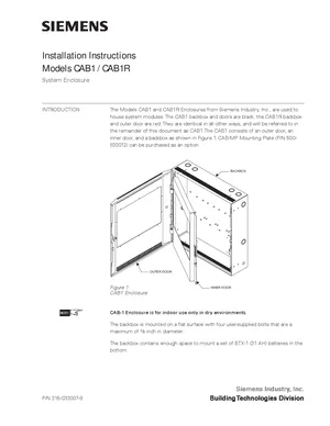 Installation Manual for the Siemens CAB1. Document No: 315-033007-9. Models CAB1 and CAB1R. Physical installation guide, backbox dimensions, and cabling specifications.