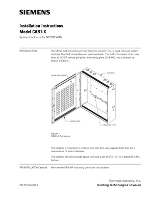 Installation Manual for the Siemens CAB1-X. Document No: 315-034369-4, Rev: 4. 4 models including CAB1-X, CAB-MP, BTX-1 and 1 additional variants. Mounting instructions, wiring diagrams, and system power-up procedures.