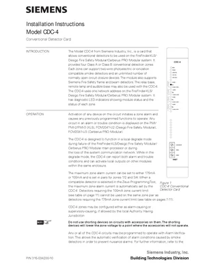 Installation Manual for the Siemens CDC-4. Document No: 315-034200-10. 81 models including CDC-4, DF-1192, DI-3 and 78 additional variants. Physical installation guide, backbox dimensions, and cabling specifications.