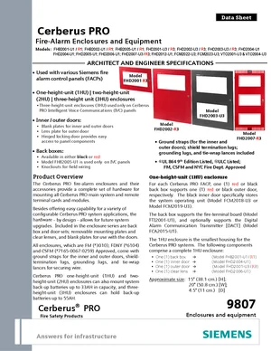 Datasheet for the Siemens Cerberus PRO Fire-Alarm Enclosures, published in 2016. Document No: 9807, Rev: 4. 50 models including FHB2001-U1, FHB2001-R1, FHB2002-U1 and 47 additional variants. Engineering specifications, wiring diagrams, and mounting dimensions.