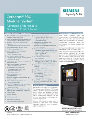 Datasheet for the Siemens Cerberus PRO Modular System, published in 2019. Document No: 8300, Rev: 5. 108 models including FCM2041-U3, PSC-12, XDLC and 105 additional variants. Detailed technical specifications, electrical ratings, and agency listings.