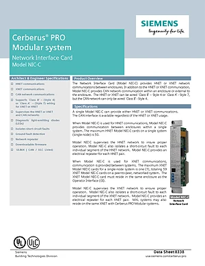 Datasheet for the Siemens Cerberus Pro NIC-C, published in 2017. Document No: 8338, Rev: 0. Model NIC-C. Product features, environmental operating limits, and compatibility data.