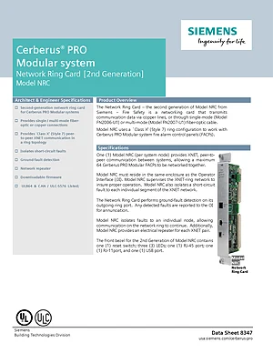 Datasheet for the Siemens Cerberus Pro NRC, published in 2017. Document No: 8347, Rev: 0. Model NRC. Detailed technical specifications, electrical ratings, and agency listings.