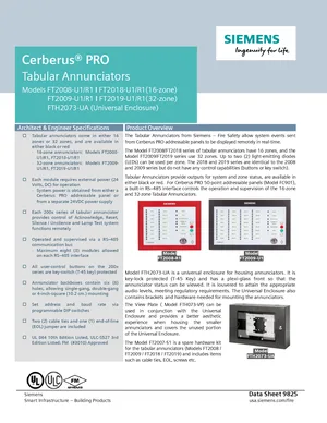 Datasheet for the Siemens Cerberus PRO Tabular Annunciators, published in 2021. Document No: 9825, Rev: 5. 19 models including FT2008-U1, FT2008-R1, FT2018-U1 and 16 additional variants. Engineering specifications, wiring diagrams, and mounting dimensions.