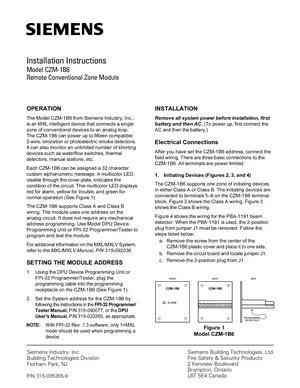 Installation Manual for the Siemens CZM-1B6. Document No: 315-095355-9. 23 models including CZM-1B6, PBA-1191, PBB-1191 and 20 additional variants. Mounting instructions, wiring diagrams, and system power-up procedures.