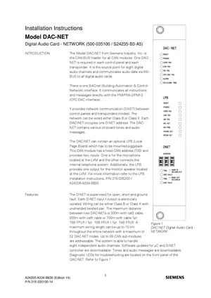 Installation Manual for the Siemens DAC-NET, published in 2012. Document No: 315-035100-14, Rev: 14. 22 models including DAC-NET, LPB, PMI and 19 additional variants. Physical installation guide, backbox dimensions, and cabling specifications.