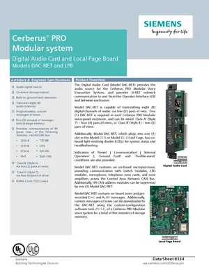 Datasheet for the Siemens DAC-NET and LPB, published in 2017. Document No: 8334, Rev: 0. 12 models including DAC-NET, LPB, CC-5 and 9 additional variants. Detailed technical specifications, electrical ratings, and agency listings.