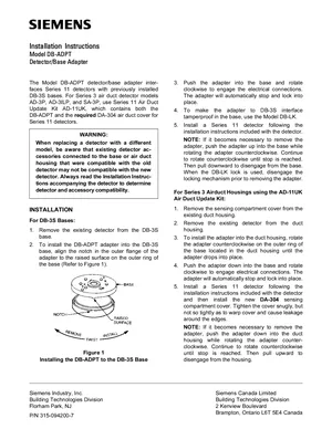 Installation Manual for the Siemens DB-ADPT. Document No: 315-094200-7. 8 models including DB-ADPT, DB-3S, AD-3P and 5 additional variants. Mounting instructions, wiring diagrams, and system power-up procedures.