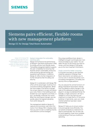 Brochure for the Siemens Desigo CC for Desigo TRA, published in 2015. Document No: 0-92334-en. Models Desigo CC and Desigo TRA. Product highlights, key features, and application overview.