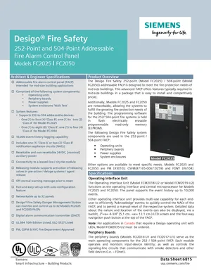 Datasheet for the Siemens Desigo Fire Safety FC2025/FC2050, published in 2021. Document No: 6815, Rev: 8. Models FC2025 and FC2050. Engineering specifications, wiring diagrams, and mounting dimensions.