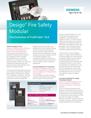 Brochure for the Siemens Desigo Fire Safety Modular, published in 2017. Document No: 153-SBT-506. Model Desigo Fire Safety Modular. Product highlights, key features, and application overview.