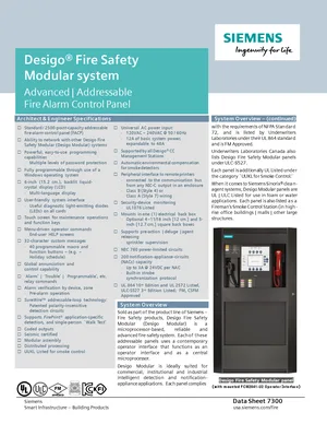 Datasheet for the Siemens Desigo Fire Safety Modular, published in 2020. Document No: 7300, Rev: 6. Model FCM2041-U2. Product features, environmental operating limits, and compatibility data.