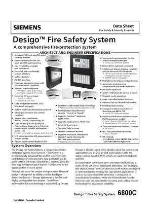 Datasheet for the Siemens Desigo Fire Safety System, published in 2013. Document No: 6800C, Rev: 4. Models FC2025, FC2050 and FT2050. Engineering specifications, wiring diagrams, and mounting dimensions.