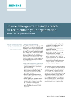 Brochure for the Siemens Desigo Mass Notification, published in 2015. Document No: 0-92338-en. System capabilities, competitive advantages, and integration options.
