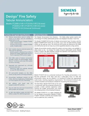 Datasheet for the Siemens Desigo Tabular Annunciators, published in 2021. Document No: 6825, Rev: 5. 9 models including FT2008-U1, FT2008-R1, FT2018-U1 and 6 additional variants. Engineering specifications, wiring diagrams, and mounting dimensions.