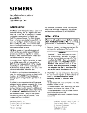 Installation Manual for the Siemens DMC-1. Document No: 315-092692-7, Rev: 7. Model DMC-1. Physical installation guide, backbox dimensions, and cabling specifications.