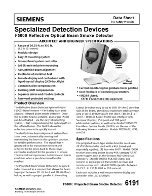Datasheet for the Siemens F5000, published in 2015. Document No: 6191, Rev: 2. Model F5000. Detailed technical specifications, electrical ratings, and agency listings.