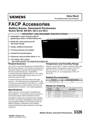 Datasheet for the Siemens FACP Accessories, published in 2012. Document No: 3326, Rev: 2. 4 models including BB-55, BB-55R, DE-2 and 1 additional variants. Engineering specifications, wiring diagrams, and mounting dimensions.