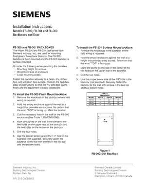 Installation Manual for the Siemens FB-300, FB-301 and FC-300. Document No: A6V10308803. Models FB-300, FB-301 and FC-300. Physical installation guide, backbox dimensions, and cabling specifications.