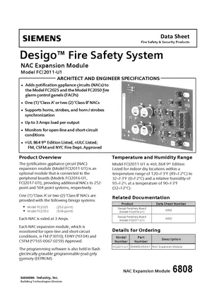 Datasheet for the Siemens FCI2011-U1, published in 2013. Document No: 6808, Rev: 2. Model FCI2011-U1. Detailed technical specifications, electrical ratings, and agency listings.
