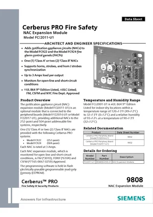 Datasheet for the Siemens FCI2011-U1, published in 2013. Document No: 9808, Rev: 2. Model FCI2011-U1. Detailed technical specifications, electrical ratings, and agency listings.